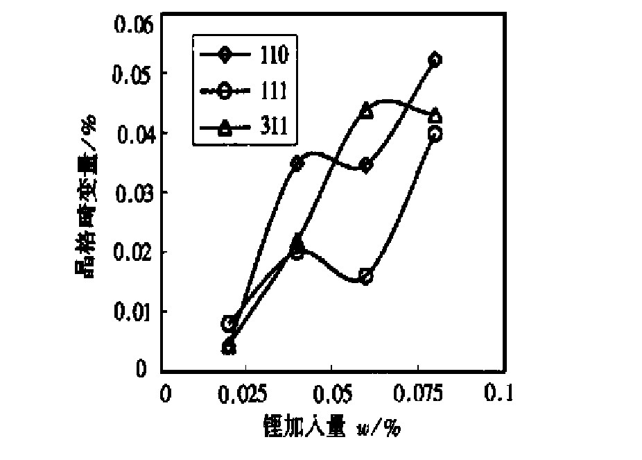 由表4中晶格畸变数据及图1可见, 随着锂加入量的增加, 晶格畸变量呈增大趋势, 由此引起的强化效应增加。
