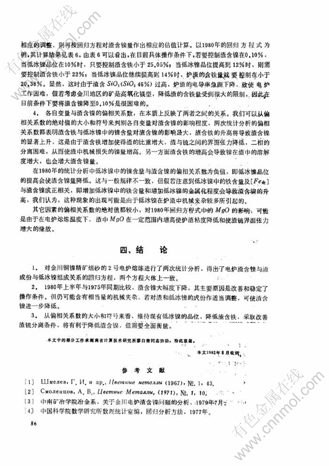 采用回归分析方法讨论了电炉渣含镍与各种因素(如炉渣和冰镍成份)之间的关系并建立了一回归方程。