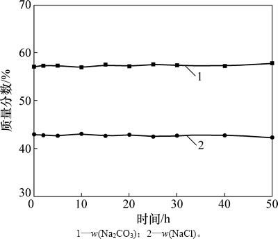采用滴定法测定了混合盐中的CO32-质量分数,进而推导Na2CO3和NaCl的质量分数,图11所示为在850 ℃下混合物中Na2CO3和NaCl的质量分数随着保温时间的变化。从图11可以看出:Na2CO3和NaCl的质量分数随着保温时间延长变化不大,考虑分析误