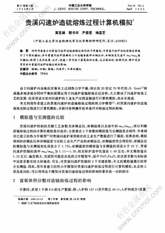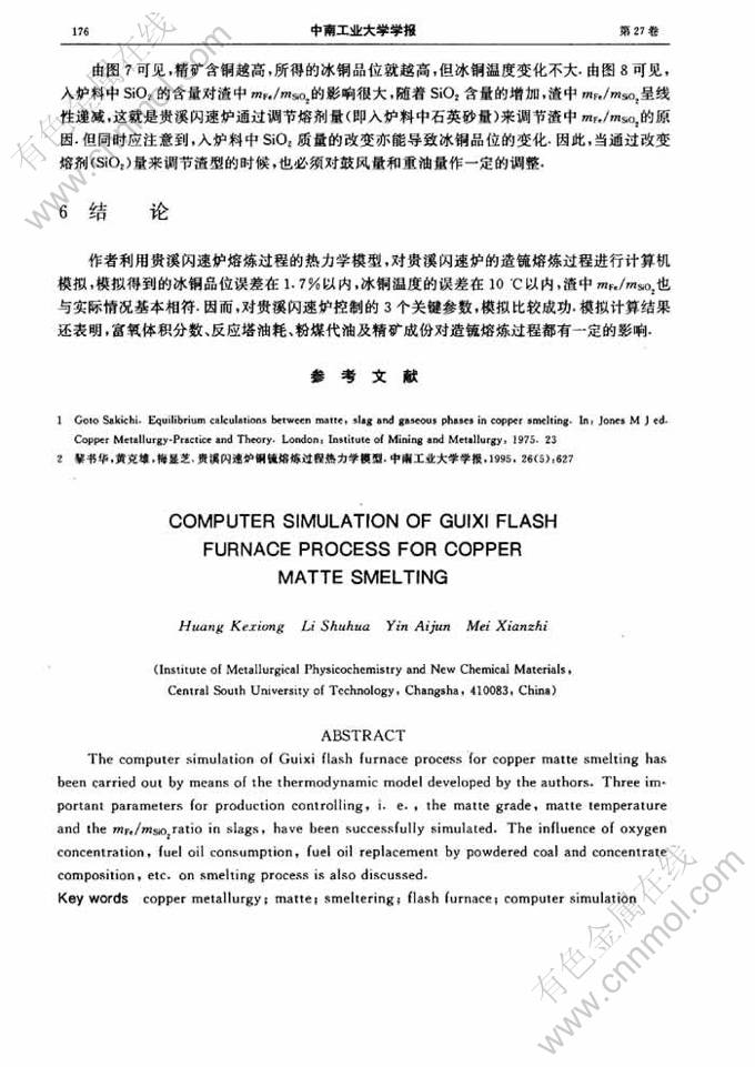 关键词:炼铜; 冰铜; 熔炼; 闪速炉; 计算机模拟;