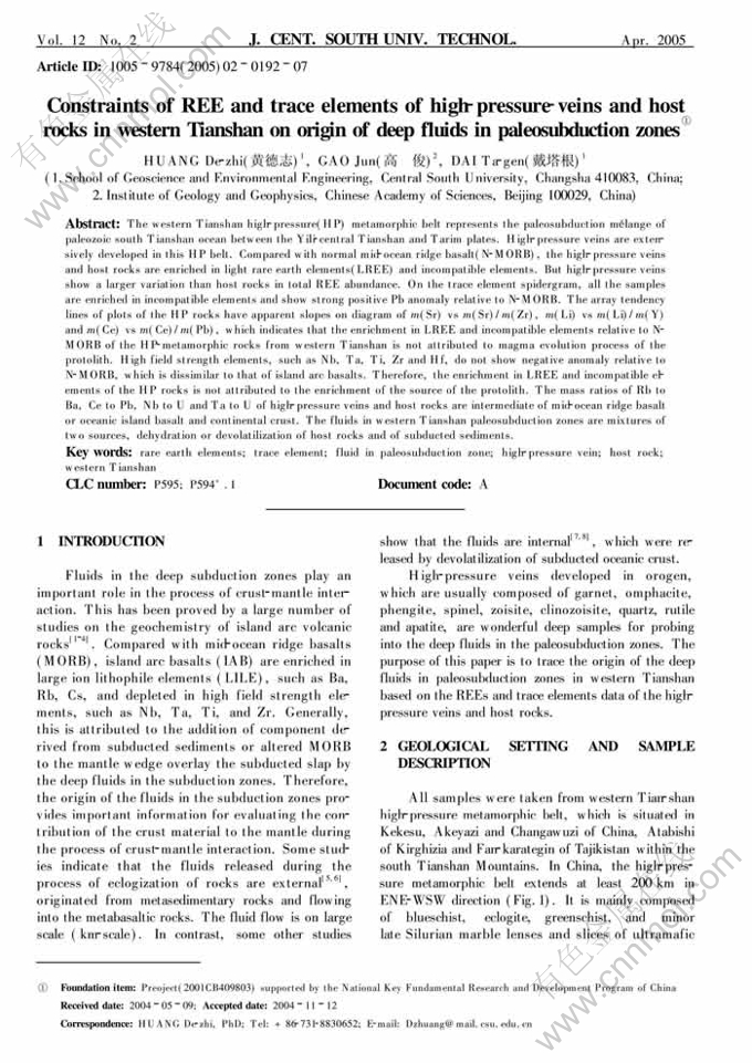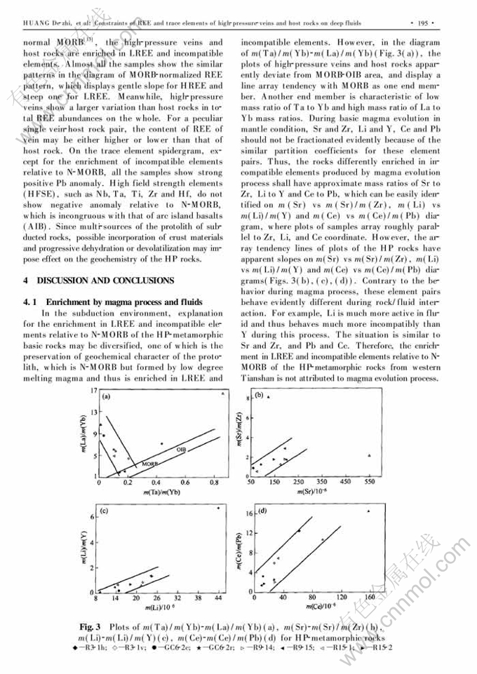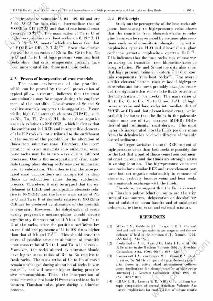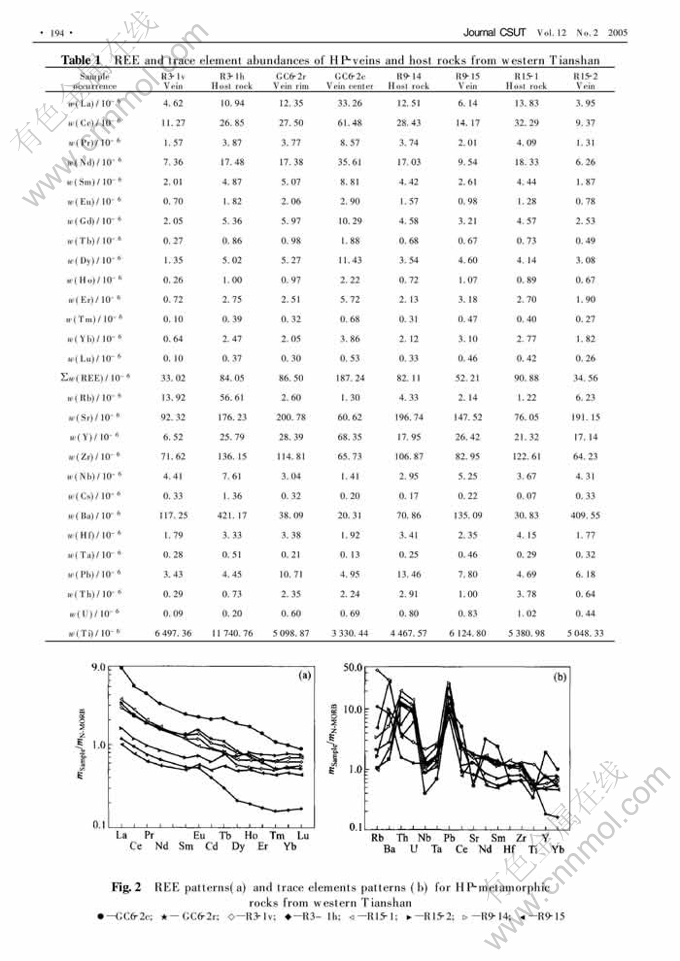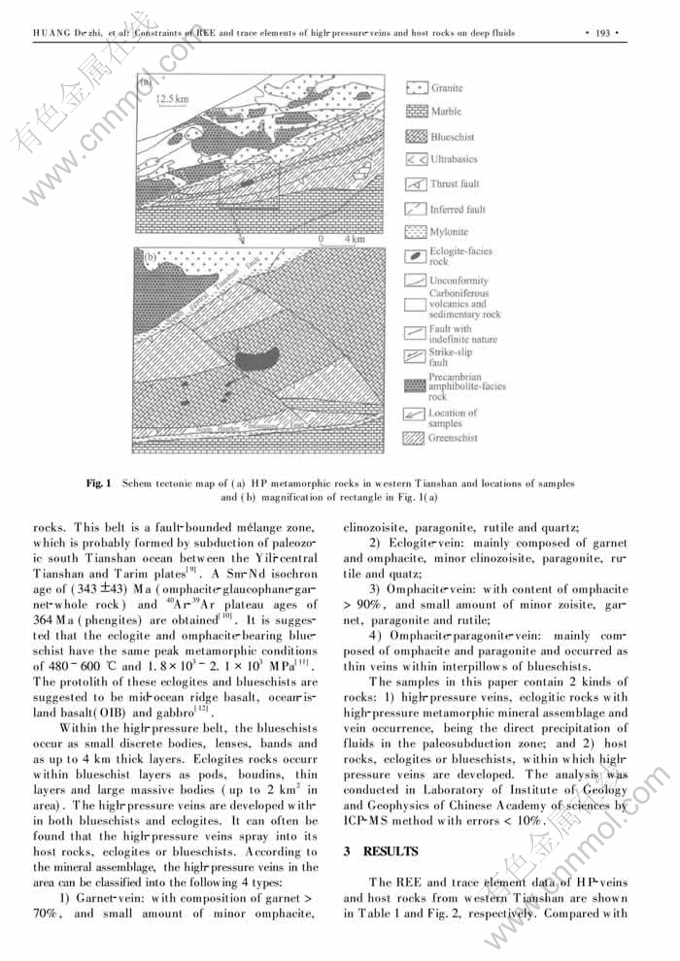 Constraints of REE and trace elements of high-pressure-veins and host rocks in western Tianshan on origin of deep fluids in paleosubduction zones①