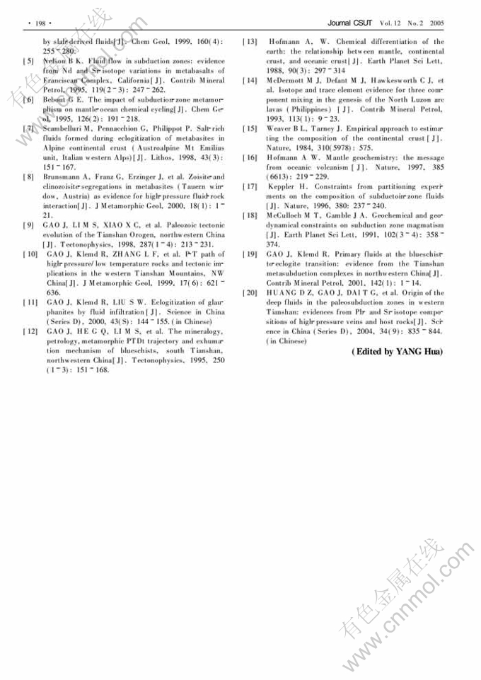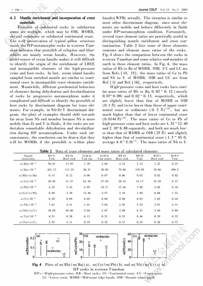Abstract: The western Tianshan high-pressure(HP) metamorphic belt represents the paleosubduction mélange of paleozoic south Tianshan ocean between the Yili-central Tianshan and Tarim plates. High-pressure veins are extensively developed in this HP belt. Compared with normal mid-ocean ridge basalt(N-MORB), the high-pressure veins and host rocks are enriched in light rare earth elements(LREE) and incompatible elements. But high-pressure veins show a larger variation than host rocks in total REE abundance. On the trace element spidergram, all the samples are enriched in incompatible elements and show strong positive Pb anomaly relative to N-MORB. The array tendency lines of plots of the HP rocks have apparent slopes on diagram of m(Sr) vs m(Sr)/m(Zr),m(Li) vsm(Li)/m(Y) and m(Ce) vs m(Ce)/m(Pb), which indicates that the enrichment in LREE and incompatible elements relative to NMORB of the HP-metamorphic rocks from western Tianshan is not attributed to magma evolution process of the protolith. High field strength elements, such as Nb, Ta, Ti, Zr and Hf, do not show negative anomaly relative to N-MORB, which is dissimilar to that of island arc basalts. Therefore, the enrichment in LREE and incompatible elements of the HP rocks is not attributed to the enrichment of the source of the protolith. The mass ratios of Rb to Ba, Ce to Pb, Nb to U and Ta to U of high-pressure veins and host rocks are intermediate of mid-ocean ridge basalt or oceanic island basalt and continental crust. The fluids in western Tianshan paleosubduction zones are mixtures of two sources, dehydration or devolatilization of host rocks and of subducted sediments.