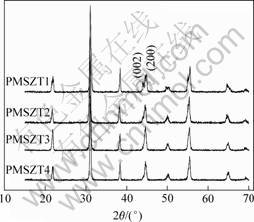 The specimens in this study were fabricated according to formula: xPb(Mn1/3Sb2/3)O3-(1-x)Pb- (Zr1/2Ti1/2)O3, x=0.06, 0.07, 0.08, 0.09, (respectively abbreviated as PMSZT1, PMSZT2, PMSZT3, PMSZT4). The specimens were prepared by traditional ceramics process. The reagent-grade Pb3O4, ZrO2, TiO2, MnO2 and Sb2O3 powders were acetone-milled for 12h in a zirconia ball mill and then calcined at 850 ℃ for 2 h. The calcined powders were ground, ball-milled again and pressed into disks using PVA as a binder. After burning off PVA, the pellets were sintered in a sealed alumina crucible at different soaking temperature (from 1 100 ℃ to 1 300 ℃) for 2 h. In order to compensate for PbO loss from the pellets, a PbO-rich atmosphere was maintained by placing an equi-molar mixture of PbO and ZrO2 inside the covered alumina crucible.