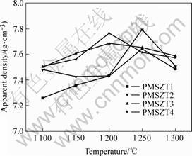Fig.3 Apparent density of PMS-PZT ceramic as function of sintering temperature