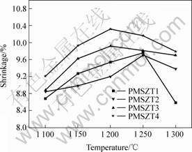 Fig.4 Shrinkage of PMS-PZT ceramic as function of sintering temperature