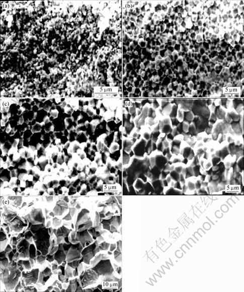 Fig.5 SEM photographs of fractured surface of PMSZT2 specimen sintered at different temperatures: (a) 1 100 ℃; (b) 1 150 ℃; (c) 1 200 ℃; (d) 1 250 ℃; (e) 1 300 ℃