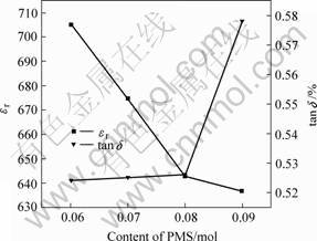 Fig.8 Variation of εr and tan δ of PMS-PZT ceramics with content of PMS