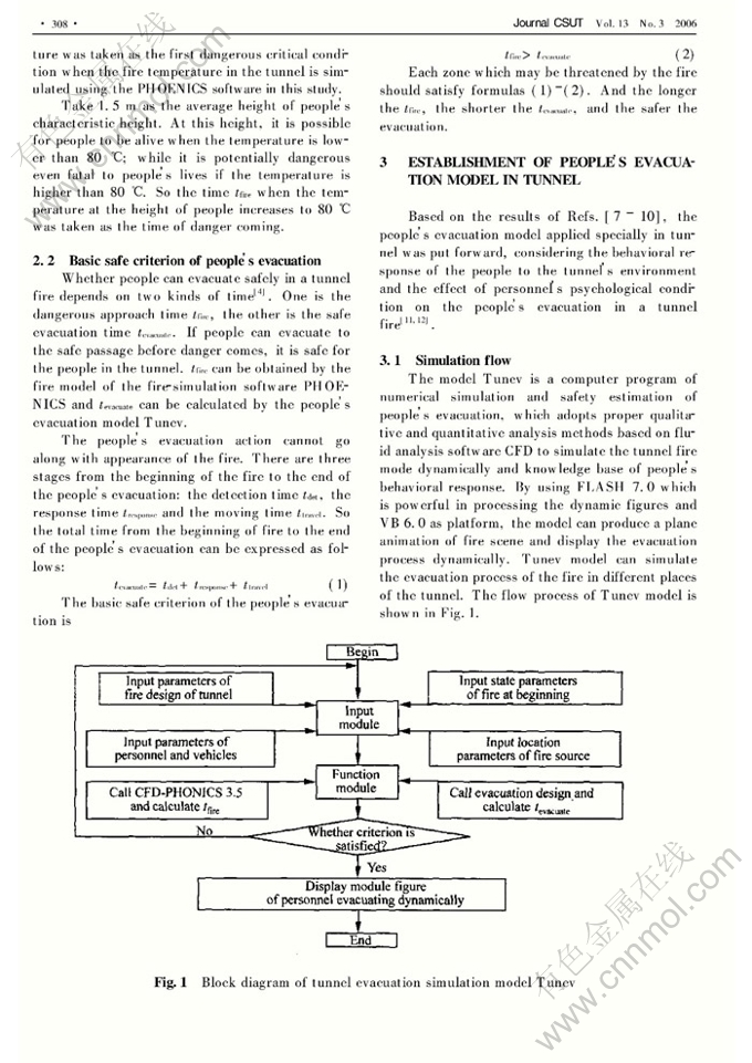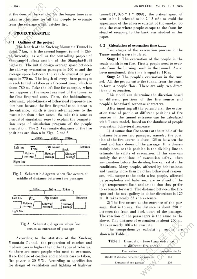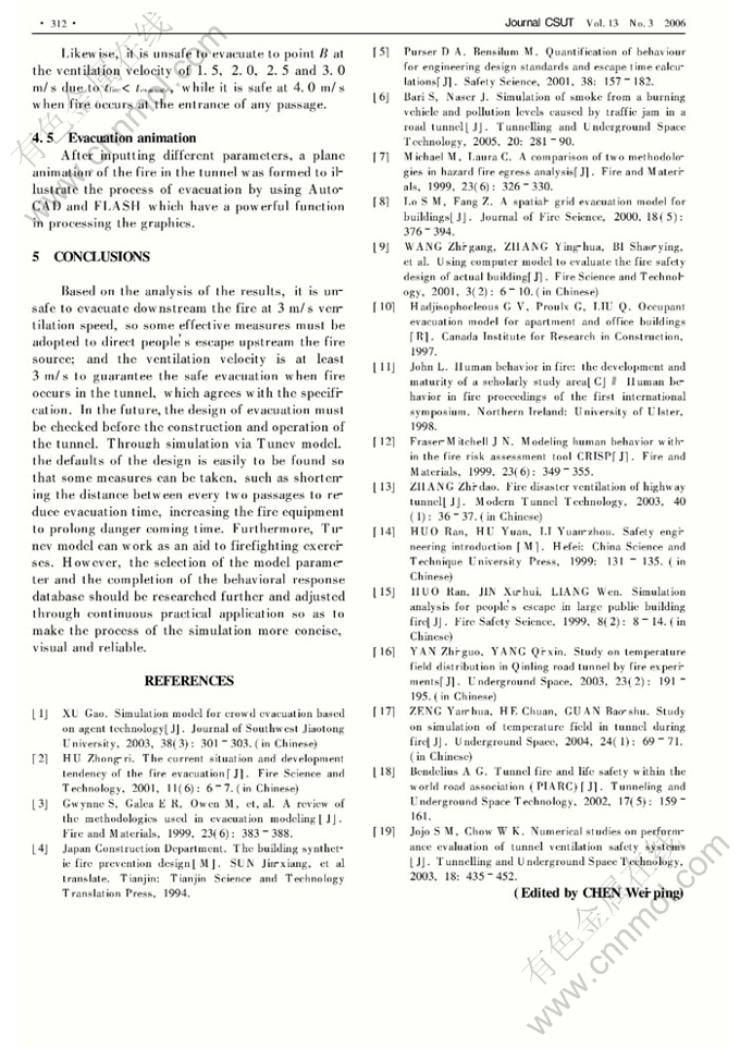 Abstract: The simulation model Tunev(tunnel evacuation) was developed for people s evacuation in tunnel fire. It contains simple database of the people s behavioral reaction and structure characteristic parameters of tunnel fireproofing. The model can be used to calculate the total evacuation time in various scenes when fire occurs in the different locations of the tunnel. Combined with fire simulation soft ware CFD POENICS3.5, Tunev model can be used to calculate the fire danger coming time; by comparing with these two kinds of time, it can be used to assess the safety of the evacuation, and the evacuation process also have a dynamic demo. The simulation results show that the Tunev model can be used to predict the reliability of safe evacuation for people in tunnel fire and provide references for people s safe escape scheme. Some relevant concepts of the model were described and an evacuation simulation of a typical tunnel case, i.e. Xuefeng Mountain Tunnel was performed by using this model. And the model svalidation and actual application were also described.