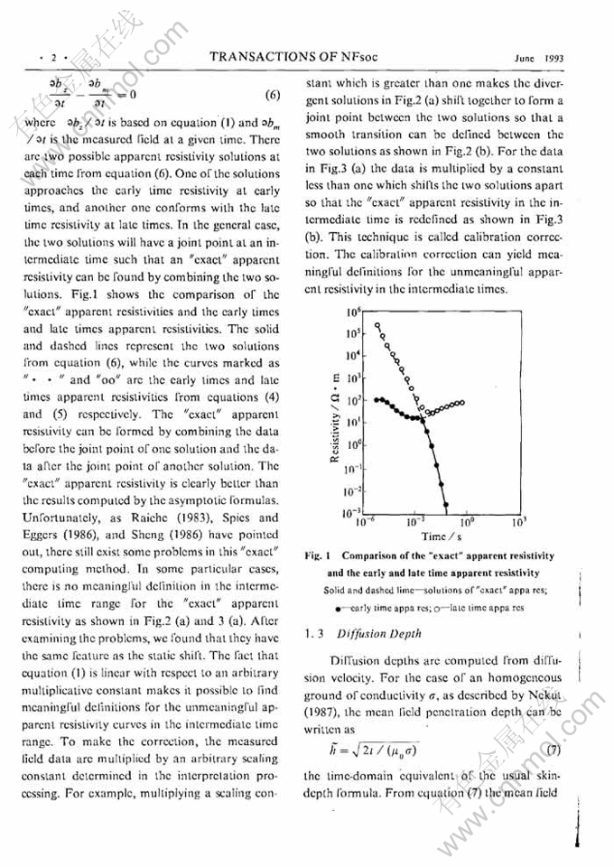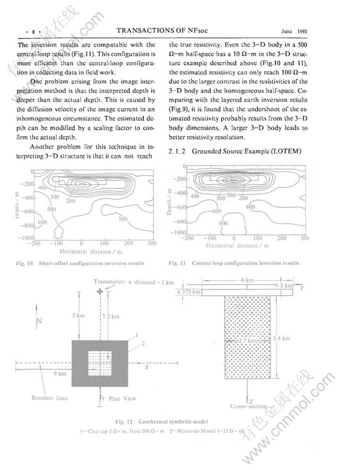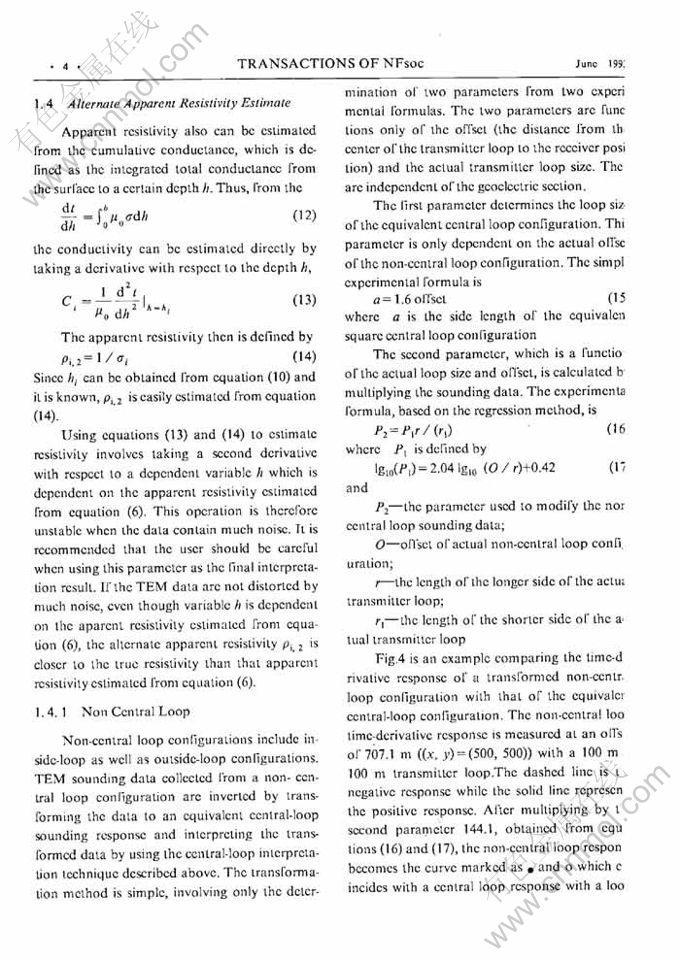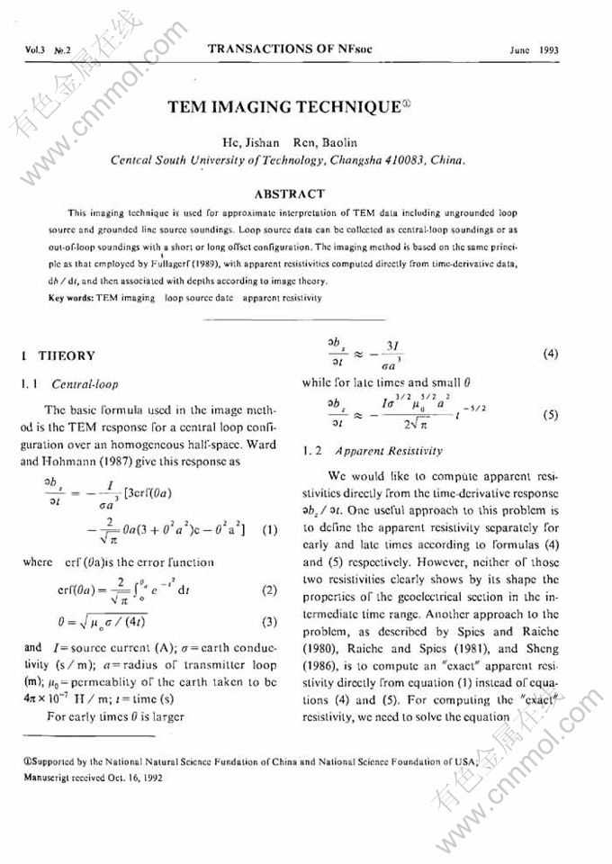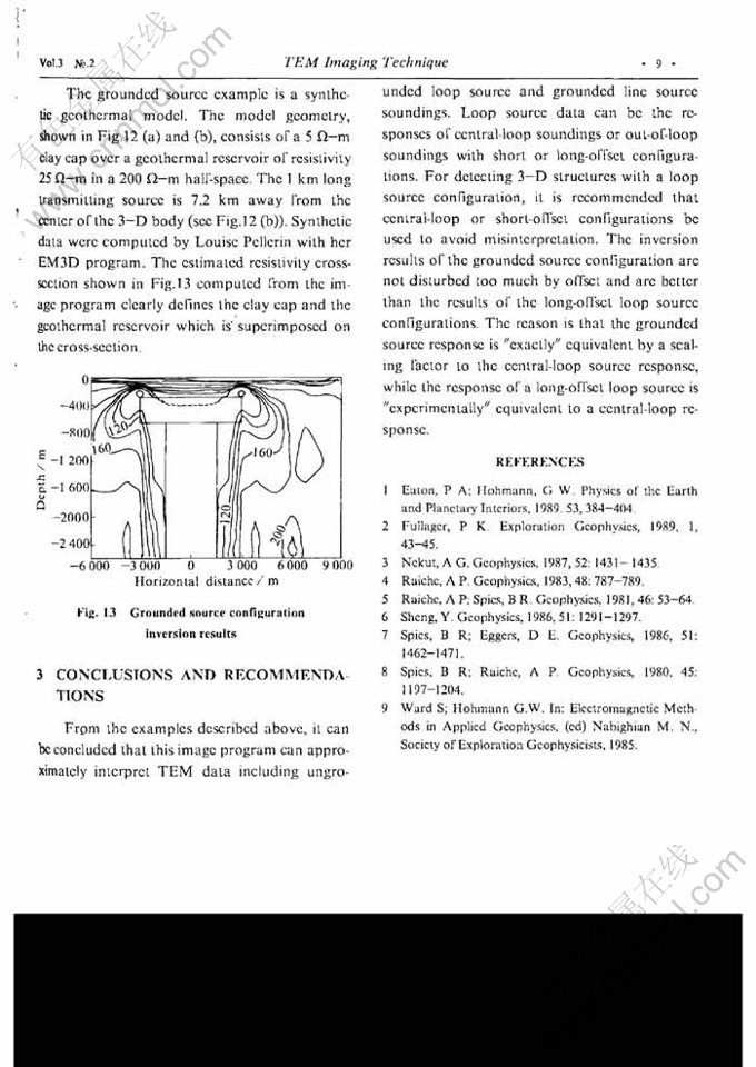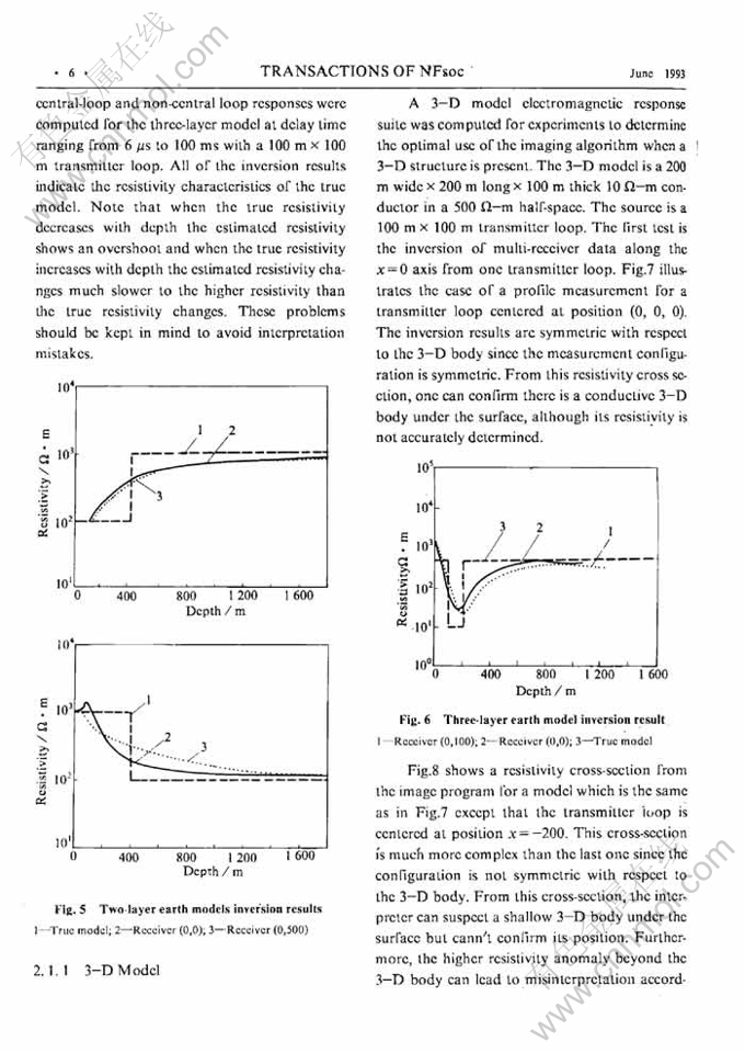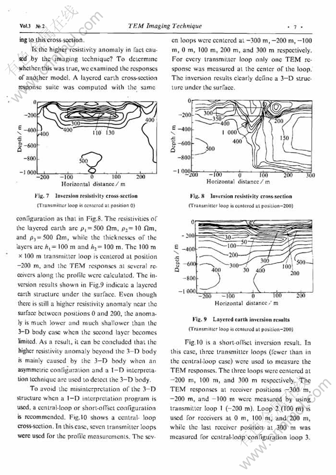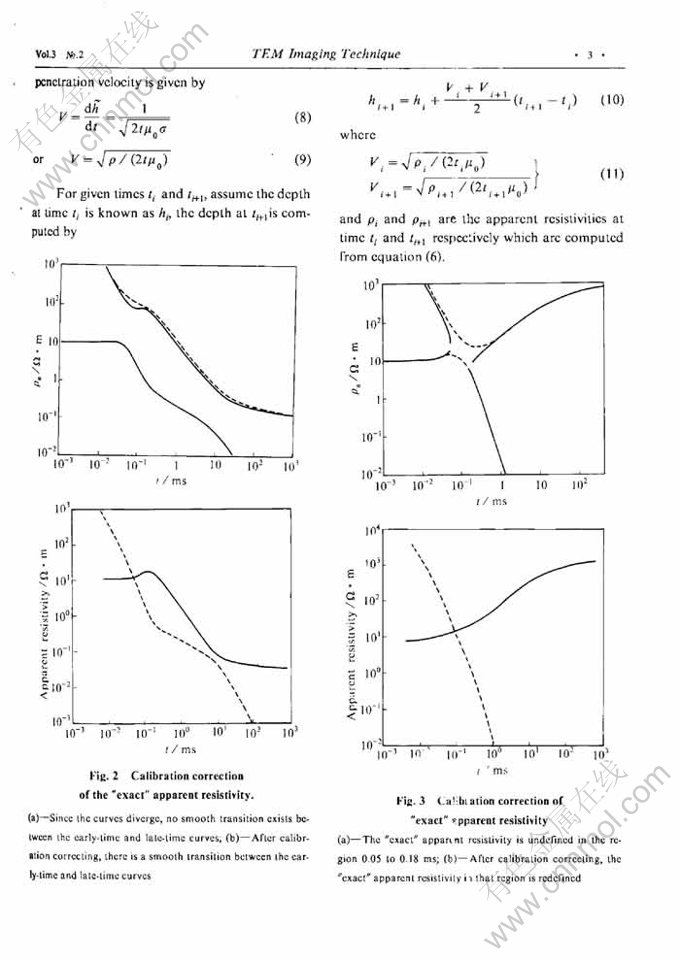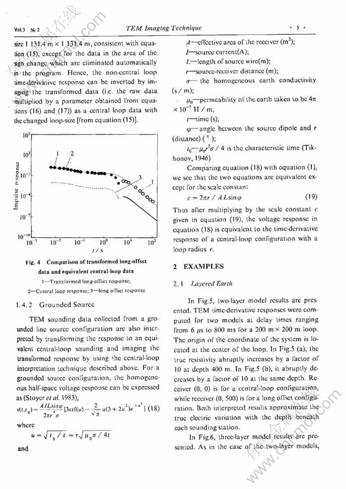 Abstract: This imaging technique is used for approximate interpretation of TEM data including ungrounded loop source and grounded line source soundings.Loop source data can be collected as central-loop soundings or as out-of-loop soundings with a short or long offset configuration.The imaging method is based on the same princi- ple as that employed by Fullager(1989),with apparent resistivities computed directly from time-derivative data, db/d,and then associated with depths according to image theory.