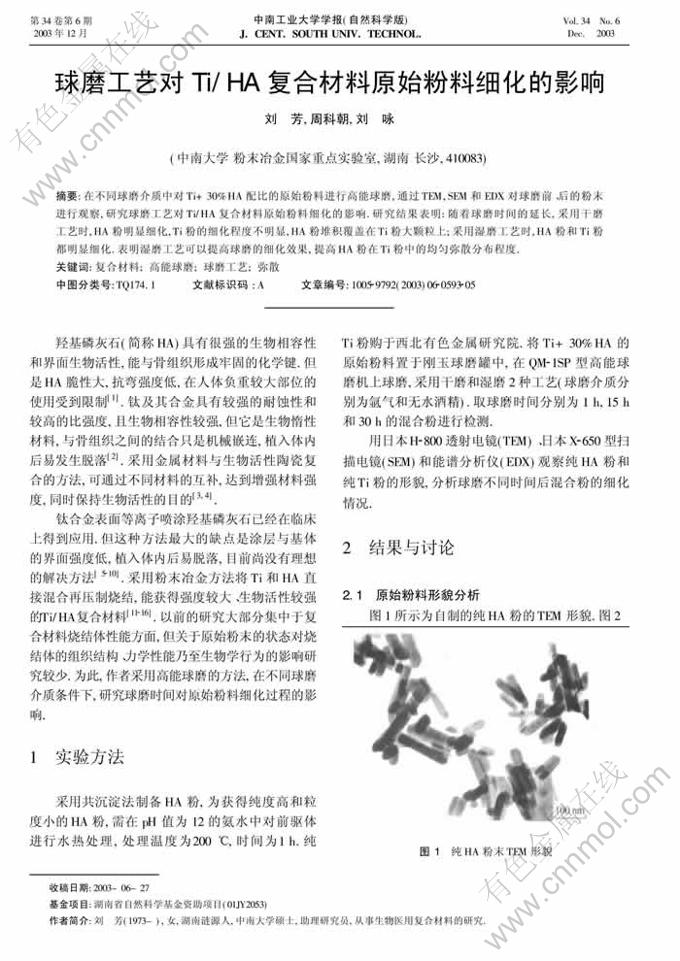 球磨工艺对Ti/HA复合材料原始粉料细化的影响