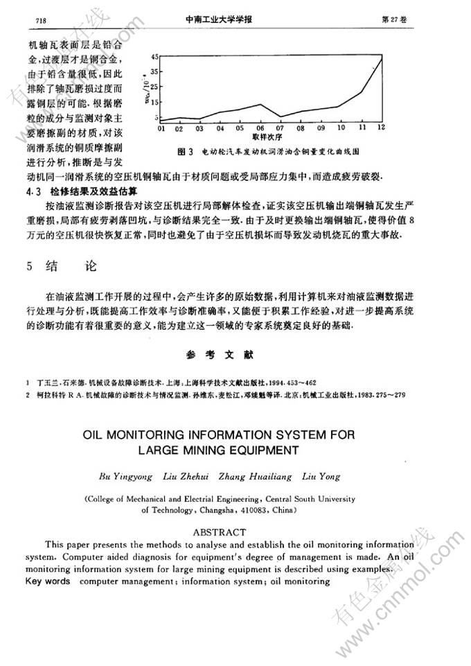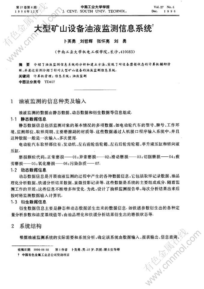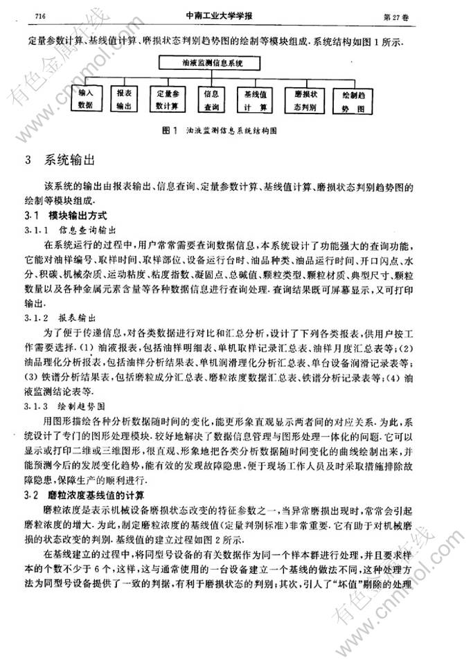 摘 要:介绍了油液监测信息系统的分析和建立方法,实现了对设备磨损状态的计算机辅助诊断,并通过实例介绍了针对大型矿山设备的油液监测信息系统.