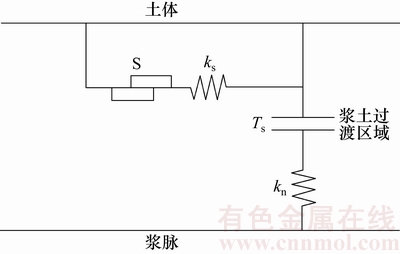 在浆液固化过程中,浆液与土体接触交界处发生的化学反应如下:浆液中多余的Ca2+与土体中的Na+发生交换;浆液中多余的硅酸离子与土体中数目较多的钙和镁等交换性阳离子反应,生成难溶性或不溶性硅酸盐。为此可将注浆加固土体划分为土体、浆脉及浆-土过渡区这3种单元。浆脉与土体通过浆-土过渡区相互作用。为了模拟浆脉与土体之间的相互作用,将浆-土过渡区等效为数学模型[23-24],如图3所示。其中:S为Coulomb滑块;ks为剪切刚度;Ts为抗拉强度;kn为法向刚度。