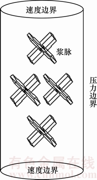 计算模型为直径为50 cm,高度为100 cm的圆柱体,其内部分布8条浆脉,浆脉空间分布示意图如图4所示。单条浆脉长×宽×厚度为3 cm×3 cm×0.3 cm。浆脉空间分布较为均匀,浆脉体积率为10.4%,可较好地表征浆脉分布较为理想的注浆加固土体。计算模型顶面与底面为速度边界,每一计算时步位移为10-7 m,侧面为压力边界(施加围压)。