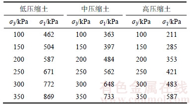 由于土体试样具有硬化特征,故将其由弹性变形向塑性变形转变时的应力作为峰值抗压强度。表6所示为土体试样与浆脉试样在不同围压条件下的峰值抗压强度。通过表6中的数据绘制一系列摩尔应力圆可得出土体试样与浆脉试样黏聚力及内摩擦角,如表7所示。