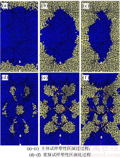 图7(a)~(c)与图7(d)~(f)所示分别为土体试样与浆脉试样塑形区演化过程。由图7(a)~(c)可知:土体试样塑性区由周边向内部发展。由图7(d)~(f)可知:浆脉边缘首先出现塑性区,随着荷载的增加逐渐向土体内部发展,最终相互搭接形成宏观破坏面。这说明浆脉边缘存在较大集中应力,故浆脉边缘首先破坏。