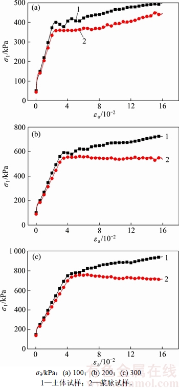 土体试样均呈现应变硬化现象,而浆脉试样在围压为100 kPa时呈现应变硬化现象,200 kPa与300 kPa时呈现应变软化特征。考虑到土体本构关系极其复杂且室内三轴压缩试验受到加载条件、浆脉空间分布等因素影响,而数值分析采用理想化的弹塑性土体本构模型及加载条件,故虽然通过数值分析获得的三轴压缩应力-应变曲线与室内试验获得三轴压缩应力-应变曲线存在差异,但均能反映浆脉骨架作用试样强度的影响。