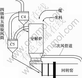 分解炉生产工艺如图1所示,生料粉经过旋风筒旋风预热器在旋风筒中与热气流充分混合,进行热交换,然后进入分解炉,并与从分解炉上部送入的煤粉混合燃烧,剧烈地进行分解反应。生料经过分解炉分解为熟料后进入到回转窑[7]。分解炉是预分解窑系统的核心部分,它承担了预分解窑系统中煤粉燃烧、气固换热以及碳酸盐分解任务。窑炉系统总燃料的60%供给分解炉,为碳酸盐分解提供热量。碳酸盐的有效分解需要一个相对稳定的温度,温度过高或者过低将会造成设备损坏和水泥质量下降。因此,保持分解炉内的温度在工艺要求的温度范围,对提高生料分解率和稳定熟料质量尤为重要。