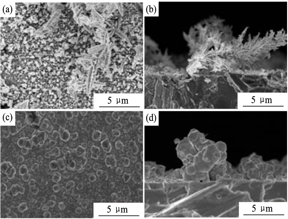 分别观察超声清洗后的活化层和相应的钯镀层形貌, 可以发现: 超声清洗后活化层上的树枝状钯粒子完全脱落, 留在基底齐整的绒毛状凸起钯粒子 (图3 (a, b) ) , 以此为基底得到的钯膜层也是平整的 (图3 (c, d) ) 。