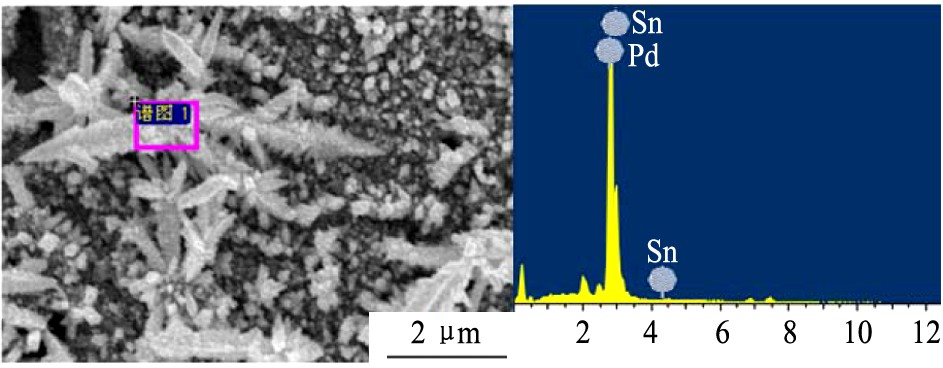 通过SEM察活化层和相应镀钯膜层, 可以发现: 活化后的表面除了绒毛状凸起钯黑粒子, 还有一些大的树枝状物 (图1 (a) , 图1 (b) ) , 经EDS分析这些树枝状物发现钯的含量为99.32%, 其余为微量残留的锡元素 (图2) 。 如果从截面进行形貌观察, 正是由于这些树枝状钯的存在, 使活化层表面非常不平整。 相应得到的钯镀层也是不平整的 (图1 (c, d) ) 。