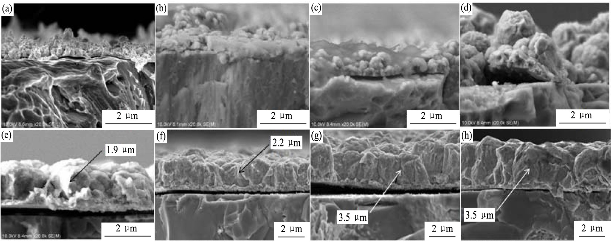 Fig.4 SEM images of cross section morphology of activation layer (a) , and layers with palladium plating 5 min (b) , 10 min (c) , 20 min (d) , 30 min (e) , 40 min (f) , 50 min (g) and 65 min (h)