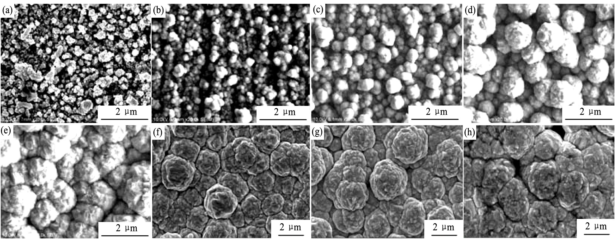 Fig.5 SEM images of surface morphology of activation layer (a) , and layers with palladium plating 5 min (b) , 10 min (c) , 20 min (d) , 30 min (e) , 40 min (f) , 50 min (g) and 65 min (h)
