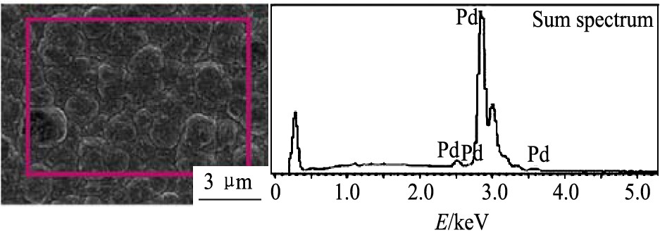 以化学镀的方法在合金薄片表面镀钯膜后, 采用Hitachi S4800扫描电子显微镜 (SEM) 对膜的表面形貌进行分析, 采用能谱仪 (EDS) 对镀膜样品中元素含量和分布进行分析, 采用X射线衍射仪 (XRD) 对膜层进行物相分析。
