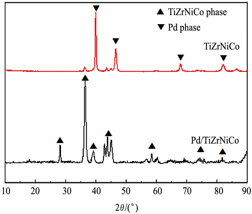 对材料进行吸氢动力学性能测试, TiZrNiCo及Pd/TiZrNiCo在“1% O2 +9% N2 +H2 ”中的吸氢动力学曲线如图9 (200 ℃) 所示: Pd/TiZrNiCo的吸氢动力学性能明显优于TiZrNiCo; 经过活化层处理及镀膜工艺改进后, 材料的吸氢量有小幅增加。 可见, 致密的Pd膜能减小杂质气体 (O2 和N2 ) 对基体合金的毒化, 使合金在混合气体中也有较高的吸氢量。
