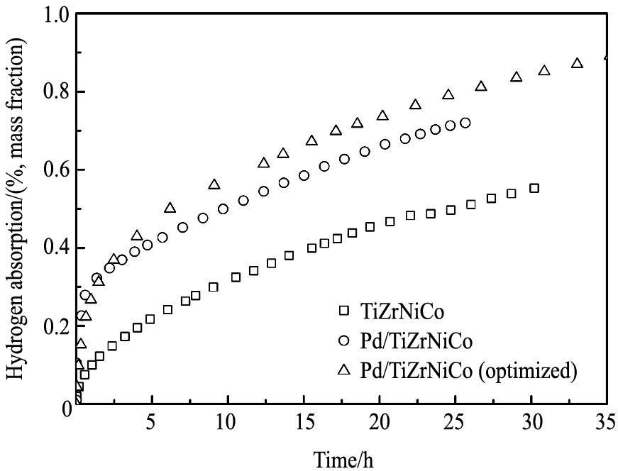 Fig.9 Dynamic curves of hydrogen absorption for TiZrNiCo, Pd/TiZrNiCo and Pd/TiZrNiCo (optimized) samples at 200 ℃