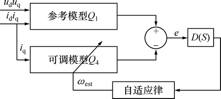 模型参考自适应辨识的主要思想就是将含有待估算参数的方程作为可调模型,将不含未知参数的方程作为参考模型,这2个模型的输出量具有相同的物理意义。工作时,利用这2个模型输出量差值,根据合适的自适应率来实时调节模型参数,以达到控制对象的输出跟踪参考模型的目的。通常根据波波夫超稳定定理[12]推导出自适应律,使系统保持稳定。