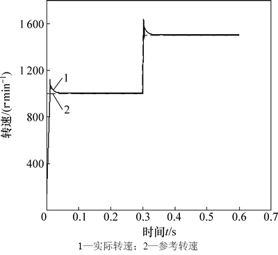 图3 n由1 000 r/min突变到1 500 r/min时实际转速和给定参考转速