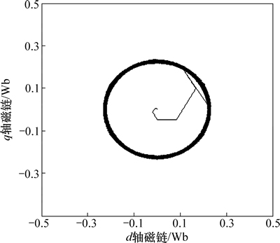 从图7可见:启动时,实际转速超调值较大,有波动,但在0.05 s时实际转速很好地跟随给定的参考速度。从图8可以看出:估算转速在0.2 s时能稳定的跟随实际速度。从图9可见:在低速时,定子磁链地观测值也近似于圆形的观测值,容差在滞环控制器的容许范围内,能较好地逼近真实值, 准确度较高。从图10可见:在低速时,定子d轴电流在启动时有较大波动,且达到稳定时有偏差,但在0.25 s时达到稳定值且波动不大。