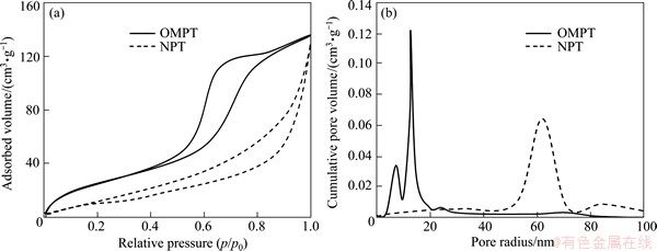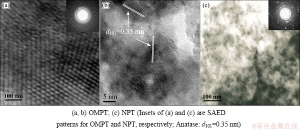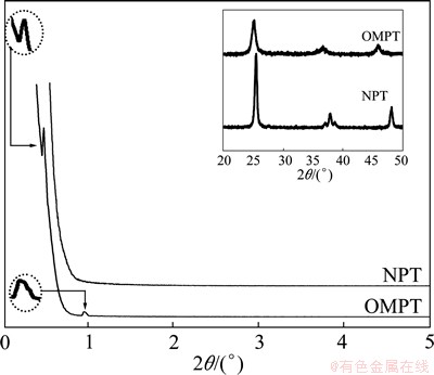 Figure 1 shows the adsorption/desorption isotherm and the corresponding pore size distribution of the TiO2 microspheric sample after calcination at 500 °C. According to BDDT classification [17], the isotherm of OMPT sample in Fig. 1(a) exhibits type IV with a hysteresis loop, indicating the presence of mesopores, which means high surface area (127.3 m2/g). Moreover, OMPT has pronounced mesoporosity, narrow pore size distribution with pore radius in the range of 2 to 20 nm calculated using the BJH equation from the adsorption branch of the isotherm in Fig. 1(b). However, NPT shows low surface area (56.2 m2/g) with macropores in comparison with OMPT. The morphology and mesoporous structure of the obtained samples were further confirmed by TEM observations in Fig. 2. TEM image of OMPT sample shows a 2D hexagonal mesostructure in Fig. 2(a), which possesses highly ordered mesopores of about 4 nm in diameter. It also shows a high degree of periodicity of 2D hexagonal arrangements over large domains. From the HRTEM image (Fig. 2(b)), it can be seen that the lattice fringe corresponding to (101) (d101=0.35 nm) crystallographic planes of anatase indicates the high crystallinity of the pore walls of OMPT. However, from TEM image (Fig. 2(c)), there are no any mesoporous structures of NPT sample. The insets of Figs. 2(a) and (c) show the selected area electron diffraction (SAED) patterns for OMPT and NPT respectively, which present well resolved diffraction rings and many diffraction spots, indicating the high crystallinity of phase-pure anatase. The typical SAXS patterns of OMPT and NPT calcinated at 500 °C are shown in Fig. 3. There are two-resolved peaks which could be indexed as the (100) and (101) reflections observed on OMPT, suggesting a highly ordered 2D hexagonal structure. These results suggest that the obtained materials possess a highly organized mesoporous structure in comparison with NPT. The inset of Fig. 3 shows the WAXRD patterns of OMPT and NPT with the presence of nanocrystalline anatase because three high-intensity crystal peaks at 25.2°-55.1° could be observed and indexed as (110), (004) and (200), respectively (JCPDS, No. 21-1272) [15]. By calculation using Scherrer equation, the crystalline sizes of OMPT and NPT are 13.7 nm and 32.0 nm, respectively.