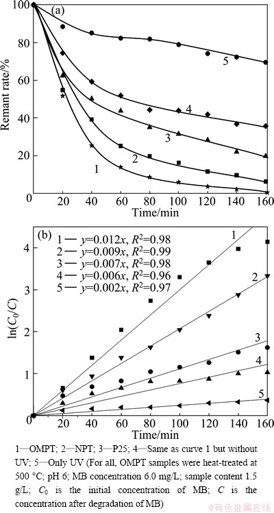 CHMELKA et al [16] synthesized a cubic mesoporous TiO2 material with anatase in the walls, which was stable up to 400 °C. Since then, several post-synthesis thermal treatment strategies have been developed for the fabrication of thermally stable mesoporous TiO2 materials. Recently, our group has synthesized stable mesoporous TiO2 nanoparticles with high crystallinity, large surface area and small particle size via a post-treatment of the Soxhlet extraction, thermal stability over 500 °C. In the present work, an evaporation induced self-assembly (EISA) technique is applied to synthesizing ordered mesoporous titania nanomaterials with high surface area and thermal stability with liquid crystal as template. Meanwhile, the effects of photocatalytic conditions on OMPT photoactivity are studied, including MB concentration, OMPT concentration and pH value.