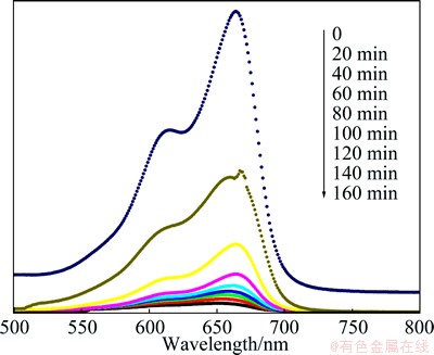 Fig. 5 Temporal spectral changes of MB in aqueous OMPT suspensions under UV illumination