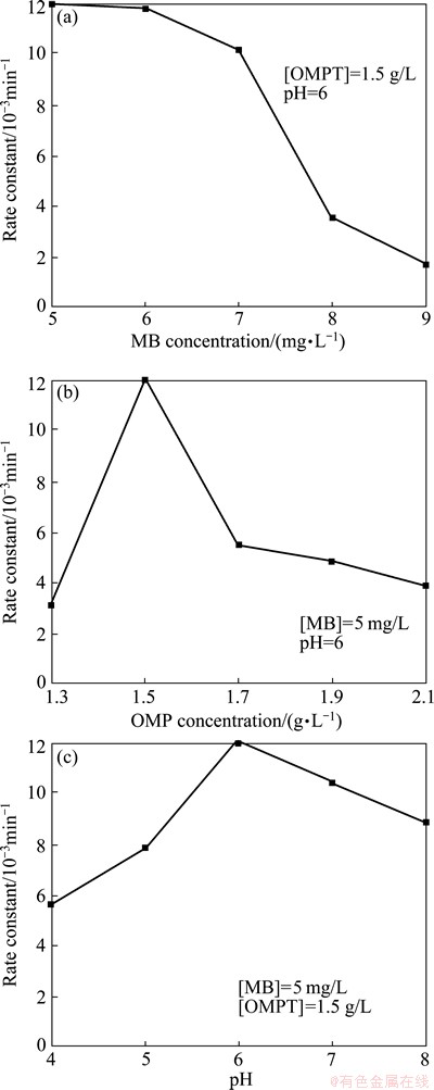 The effect of initial MB concentration on degradation rate was studied by varying the initial concentration from 5 to 9 mg/L, and the results are depicted in Fig. 6(a). It is clear that the degradation rate kapp is from 12.2×10–3 to 2.0×10–3 min–1 in the MB concentration range of 5-9 mg/L. The results show that the kapp decreases with an increase in the initial concentration of MB. This can be a result of blocking of the photocatalytically active sites on the surface of catalyst particles by MB molecules and reducing the interaction of photos with these sites. Another possible reason is that a mass of UV light may be absorbed by the MB molecules in aqueous solution rather than the catalyst particles for high MB concentration, which can also reduce UV light adsorption of catalysts to a certain extent [19]. Moreover, the increase of initial concentration of MB provides further negative effects on its degradation, leading to the efficiency of the catalytic reaction. The reaction rate as a function of catalyst concentration is important [21]. Hence a series of experiments were carried out to find the optimum catalyst concentration by varying OMPT concentration from 1.3 to 2.1 g/L (Fig. 6(b)). It is observed that there is a steady increase in the degradation efficiency up to 1.5 g/L of the catalyst beyond which the degradation efficiency decreases. This can be explained as follows. The turbidity of the solution above 1.5 g/L reduces the light transmission through the solution, while below this level the adsorption on TiO2 surface and the absorption of light by TiO2 are the limiting factors. WEI and WAN [22] also reported that the catalyst concentration has both positive and negative impacts on the photodecomposition rate. The increased concentration of catalyst increases the quantity of photons absorbed and consequently the degradation rate. Further increase in the catalyst concentration beyond 1.5 g/L may result in the deactivation of activated molecules due to collision with the ground state molecules [23]. At concentrations higher than 1.5 g/L, OMPT aggregation (particle–particle interactions) may commence and lower the effective surface area of the catalyst, and adsorption of the reactant.