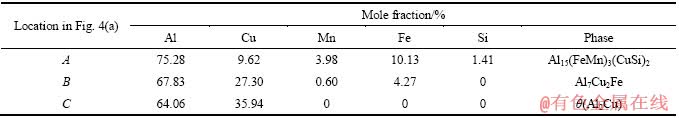 合金经T5热处理后,抗拉强度和屈服强度明显增加,而伸长率稍有下降。这主要是因为合金中的θ(Al2Cu)相在固溶时效后弥散析出,而富Fe相形貌基本上不发生变化,从而导致强度增高,伸长率稍有下降。