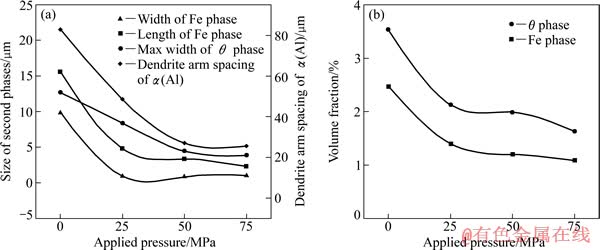铸态合金各相的尺寸和体积分数随挤压压力变化如图5所示。从图5(a)可见,当挤压压力由0增大到75 MPa时,α(Al)二次枝晶间距从82.8 μm 减小到25.5 μm,减小了69%。汉字状α-Fe相的平均长度由15.56 μm减小到2.29 μm,平均宽度由9.88 μm 减小到1.05 μm,θ相的最大宽度也由12.7 μm减小到3.87 μm。从图5(b)可见,随着挤压压力的增大,富Fe相和θ相的体积分数逐渐降低,当挤压压力由0增大到75 MPa时,富Fe相体积分数由2.47%减小到1.09%,θ相的体积分数由3.53%减小到1.63%。可见,随着挤压压力的增大,合金中各相尺寸变小,相同面积下合金中的第二相体积分数减小。