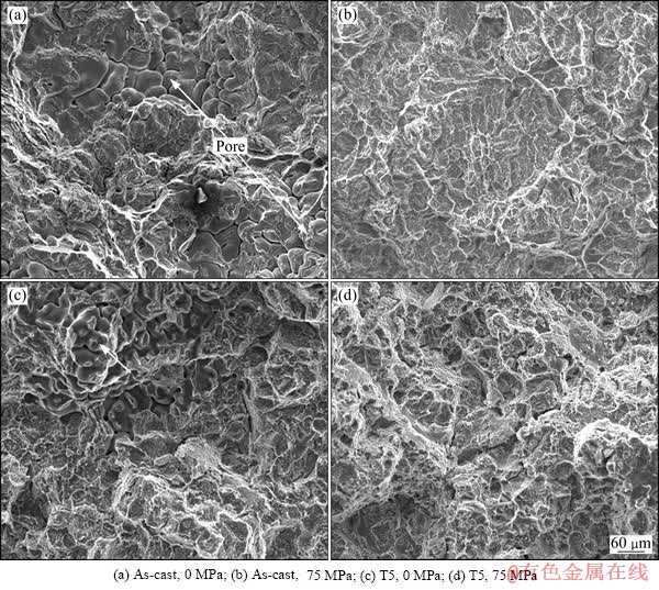不同挤压压力下铸态和T5热处理态合金的断口形貌如图6所示。从图6可见,不同挤压压力下,合金显著差别如下:0 MPa压力下,合金断口上出现很多枝晶状缩松组织;而75 MPa压力下,显微缩松基本消失,合金发生了很大的塑性变形,出现大量的韧窝。此外,相对于铸态合金,T5热处理态合金的韧窝中存在许多细小的第二相质点。