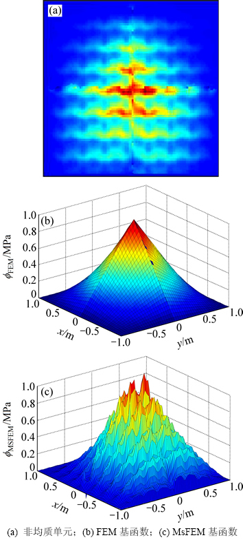 分别FEM和MSFEM基函数。通过求解基于控制方程微分算子在单元上的局部方程得到MsFEM的基函数,这样自动将小尺度信息引入到大尺度范围下。若微分算子含有振荡项,则MsFEM基函数也具有相应的振荡特征(图1(c)) 。从图1可以看出:对于非均质单元,MsFEM基函数能够很好地反映单元参数变化,从而MsFEM采用较粗的单元剖分就能刻画出研究区域,从而降低计算量。