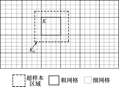 为避免在求解多尺度映射局部问题时由于网格大小与物理小尺度大小相近而引起的共振误差,同时也为进一步提高MsFEM的精度及收敛速度,可采用超样本技术来求解非线性问题的基函数。 超样本技术的思路就是将原单元放大,先在放大的单元上求得临时基函数,然后根据临时基函数得到原单元上的基函数。