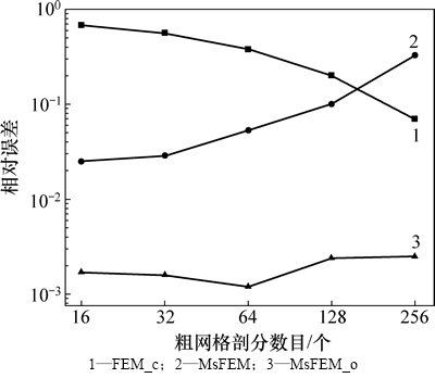 ;k0为原始地层压力下的渗透率,μm2;p0为原始地层压力,MPa;p为地层压力,MPa;α为储层压力敏感系数,1/MPa;μ为流体黏度,mPa·s。模型长×宽为1 m×1 m,上下边界为不渗透边界,左右边界分别为定压边界,原始地层压力为10 MPa,注入压力和采出压力分别为15 MPa和5 MPa,模型如图3所示。取α=0.05,μ=1 mPa·s。由于该模型无法得到解析解,本文采用FEM求得的精细解作为参考解。令N为各个方向粗网格剖分数目,FEM计算采用的网格剖分取N=512。图4所示为不同剖分情况下,粗网格单元上计算的传统有限元法FEM_c,MsFEM和超样本技术的多尺度有限元法MsFEM_o对应的相对误差。从图4可以看出:FEM_c的计算结果相对误差最大;随网格剖分数增多,MsFEM相对误差相应增大,这是共振效应所致;采用超样本技术的MsFEM_o明显提高了计算精度,而且避免了共振效应; MsFEM_o与参考解吻合较好,从而验证了该算法在处理椭圆型方程的正确性。