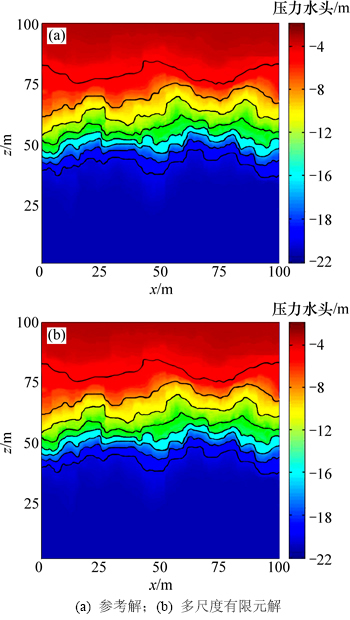 非线性现象广泛存在于自然界和人类社会等众多领域中。随着科学技术的发展,反映现实自然现象的非线性现象逐渐引起人们的极大关注,对非线性问题的研究日渐深入。非线性数学物理方程涉及水文地质、土木工程和石油工程等多个领域,例如非均质多孔介质中非饱和水流问题、 致密油气藏和低渗油藏渗流问题等。近几十年来,对这类非线性方程精确求解是许多国内外专家学者共同关注的问题。实际地层的渗透率分布通常具有很强的随机性, 地层各种参数在空间上具有显著的多尺度特征[1]。因此,在求解非均质介质中非线性问题的主要困难在于方程系数呈现非线性和空间变异性,而计算精度在很大程度上取决于模型的精度。目前地质建模技术可生成精细地质模型,其中包含大量的地质信息数据,一般的地质模型可达数百万甚至数亿个网格单元,若采用传统的有限差分或有限元法求解[2-7],则需对小尺度信息进行分析,导致计算量巨大,很难实现数值模拟。在实际工程计算中,许多研究者采用网格粗化法模拟这类问题[8]。网格粗化的目的是通过在小尺度上进行计算来预测大尺度上的有效性质,网格粗化后计算量将大大减少,但粗化后的大尺度模型数值模拟不能充分捕捉其小尺度特征。对此,近年来国内外不少研究者提出了一些多尺度数值模拟方法,如多尺度有限元法[7]、非均质多尺度法。多尺度有限元法(multiscale finite element method,MsFEM)是基于有限元法发展起来的一种多尺度数值方法,不同于网格粗化法,该方法是以具有原分辨率的全局问题为目标并在粗网格上进行求解,因此,该方法在降低计算量的同时还能充分地捕捉到小尺度特征。MsFEM最初源自