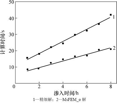 图9所示为在不同时刻多尺度有限元法与精细求解的计算时间对比。从图9可知:多尺度求解比精细求解节省了约40%的时间。多尺度有限元法未能在很大程度上减少计算时间,这是由于计算开始时,计算多尺度基函数耗时较长;而随后只需对多尺度基函数进行局部重建,节省了计算时间。从以上对比情况可以看出,多尺度有限元法在保证计算精度的同时节省了计算时间。