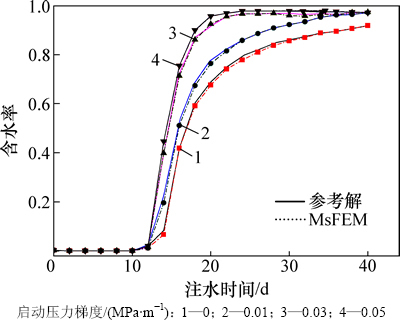 ,残余油饱和度Sor=0.4,束缚水饱和度Swc=0.25。油相相启动压力梯度分别取0,0.01,0.03和0.05 MPa/m,相应的水相启动压力梯度分别取0,1,3和5 kPa/m。