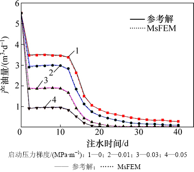 图10和图11所示分别为不同压力梯度下,MsFEM计算得到生产井含水率和产油量与时间的关系曲线与参考解的对比。从图10和11可以看出:sFEM所得结果与参考解吻合较好,MsFEM在低渗透油藏两相渗流模拟中应用效果较好;启动压力梯度越大,含水率增长幅度越大,采收率也越低,因此,由于低渗透储层存在启动压力梯度导致这类油藏开发难度大。同时,采用MsFEM求解所耗费时间明显缩短,从而,MsFEM在保证计算精度的同时,大节省了计算时间。
