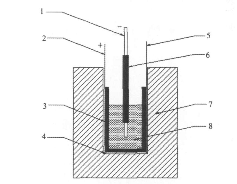 1-Cathode;2-Anode;3-Graphite crucible;4-Ceramic facing;5-Thermocouple;6-Ceramet protective pipe;7-Resistance furnace;8-Molten salt electrolyte