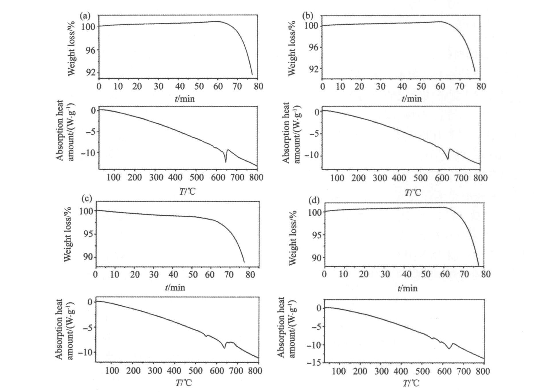 图3中在650 ℃附近出现的吸热峰是由于熔盐熔化所致, 4种熔盐的吸热峰分别出现在643, 640, 635和628 ℃; 图3(d)中在548和585 ℃附近出现的吸热峰是K2 HfF6 结构发生转变和新物相生成。 因此NaCl-KCl-K2 HfF6 体系的熔化范围为606~648 ℃。 NaCl, KCl摩尔比为1∶1的体系的最低共熔温度是650 ℃