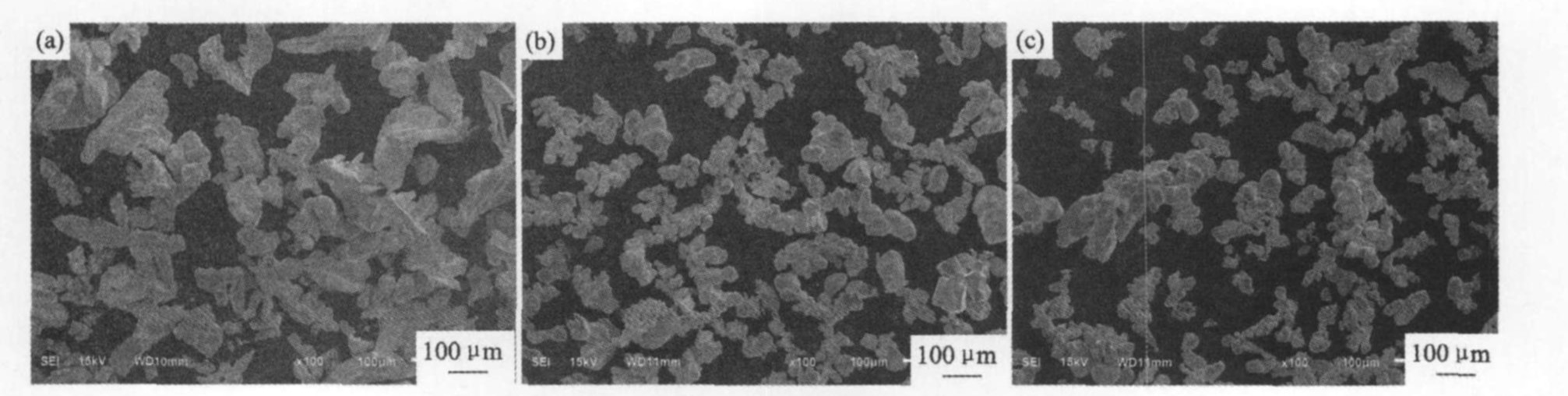 采用还原铪粉作为阳极料, 不同电流密度下得到的铪粉的显微形貌如图4所示。 图4(a)大多是块状颗粒, 粒径比较大; 图4(b)分布着许多树枝状类晶体, 且有一定的结晶取向; 图4(c)颗粒形貌不规则, 大小不一。
