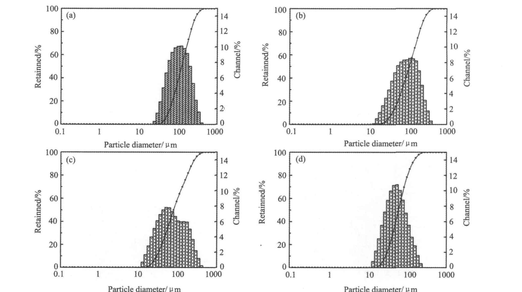 图5可以看出, 4种条件下得到的铪粉的D 50 分别为118, 104, 79, 67 μm, 主要粒度分别区间分别为: 80~150, 75~180, 40~110, 40~90 μm。 样品1和4粒度分布相对集中, 如图5(a, d)所示, 样品2和3粒度分布比较宽, 图5(b, c)所示。