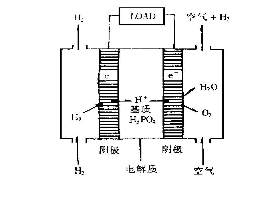 PAFC用的电解质磷酸是唯一无需用水而实现自电离的质子导体, 以H4PO4+的形式传导电流。一般采用工作温度达160~220℃的浓磷酸作电解质, 用SiC作固持磷酸的基质。也有将浓磷酸电解质掺合到稳定的多孔隔膜材料之内的。隔膜由聚四氟乙烯 (PTFE) 与SiC的复合材料构成。
